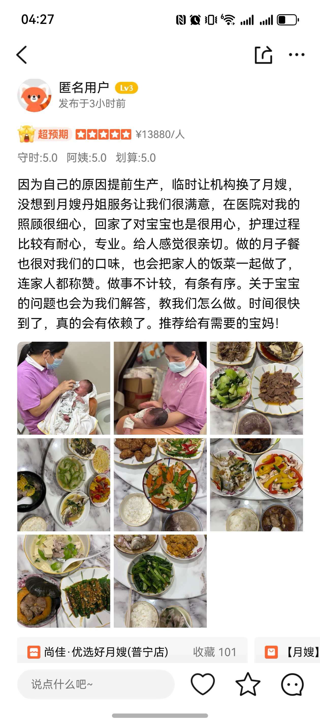 卓月嫂對(duì)寶寶哭鬧耐心安撫,對(duì)產(chǎn)婦需求及時(shí)響應(yīng),與家庭成員融洽相處,主動(dòng)記錄寶寶作息(喂奶、睡眠時(shí)間表),保持護(hù)理日志,服務(wù)態(tài)度好!