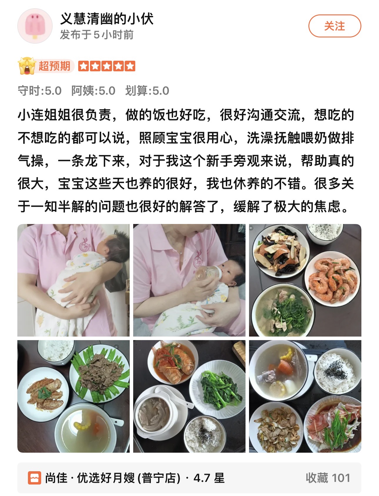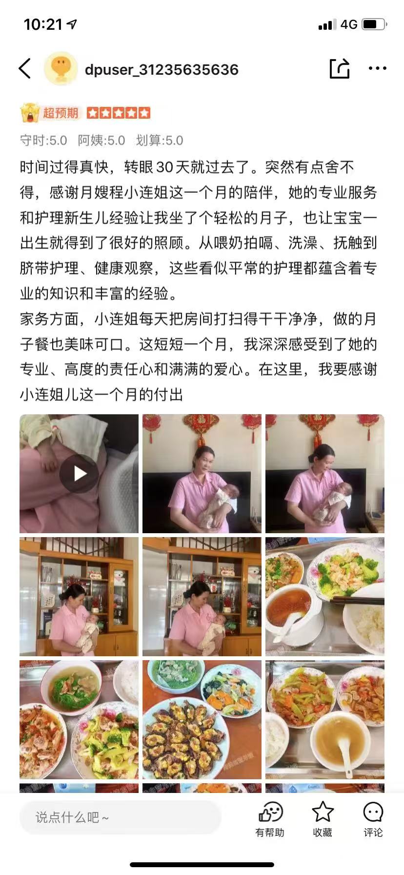 程小連來自廣西,積極向上,做事勤快,做到盡心盡力服務(wù),對(duì)待寶寶如同自己孩子,對(duì)寶媽的護(hù)理也是細(xì)心貼心,對(duì)待寶媽家里人也是熱情開朗,做事認(rèn)真負(fù)責(zé),踏實(shí)肯干。