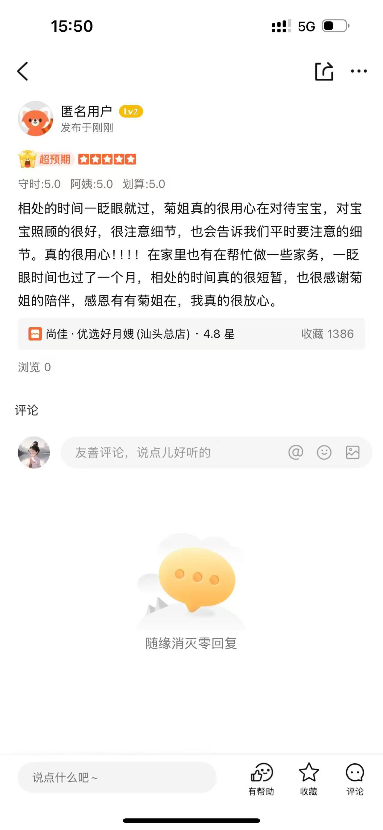 沈姐來自湖北,待人誠懇,心地善良,眼里有活,對寶寶非常細心,常常會和寶寶做互動,對媽媽的日常照料也是無微不至,月子餐做的也美味,推薦~