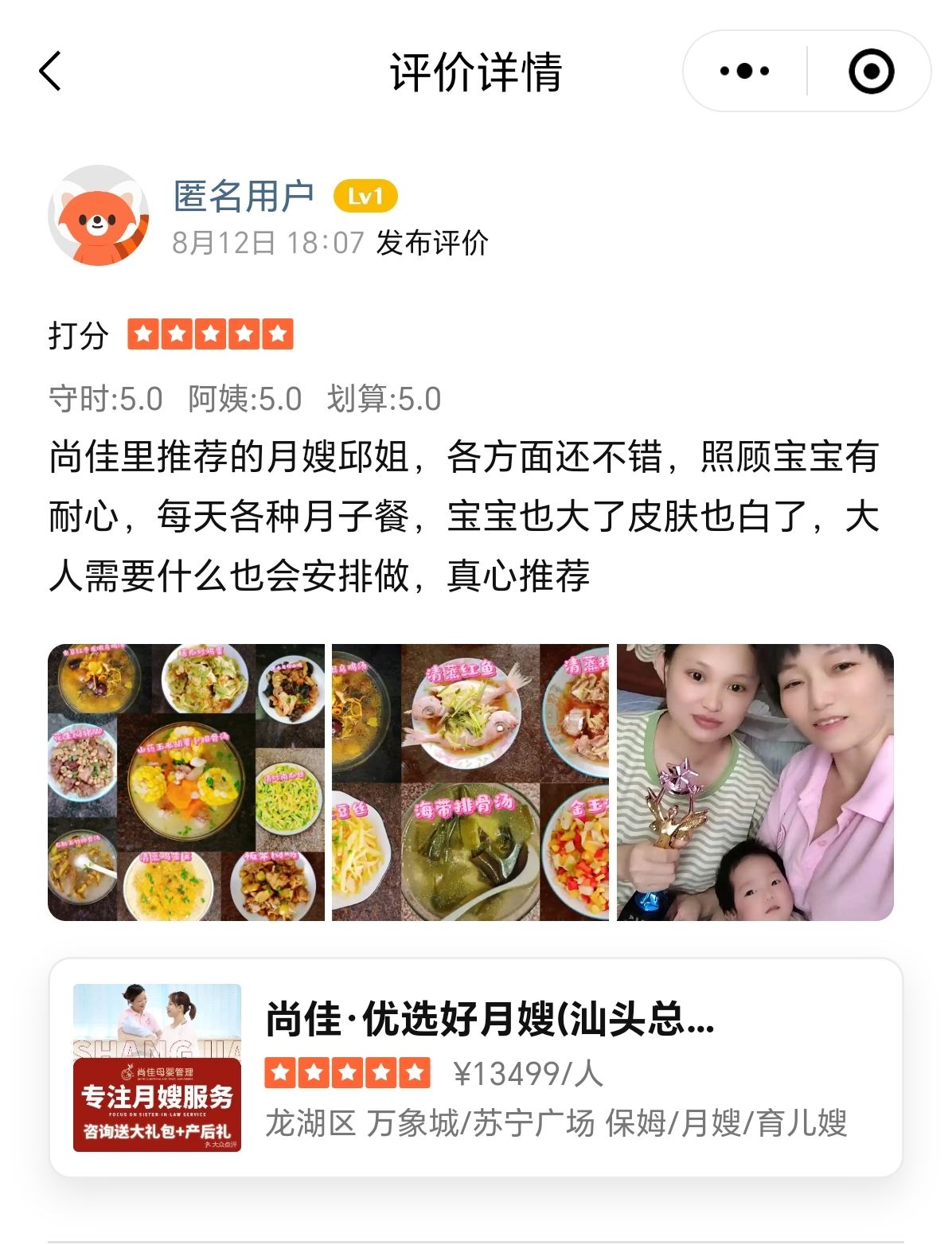 娟姨來自江西省九江,性格很好,做事細(xì)心耐心,性格開朗,眼里有活。在照顧產(chǎn)婦上細(xì)心周到,關(guān)注產(chǎn)婦恢復(fù)情況,對寶寶的日常護(hù)理非常專業(yè),讓寶寶健康成長,寶媽對阿姨的服務(wù)都給予好評