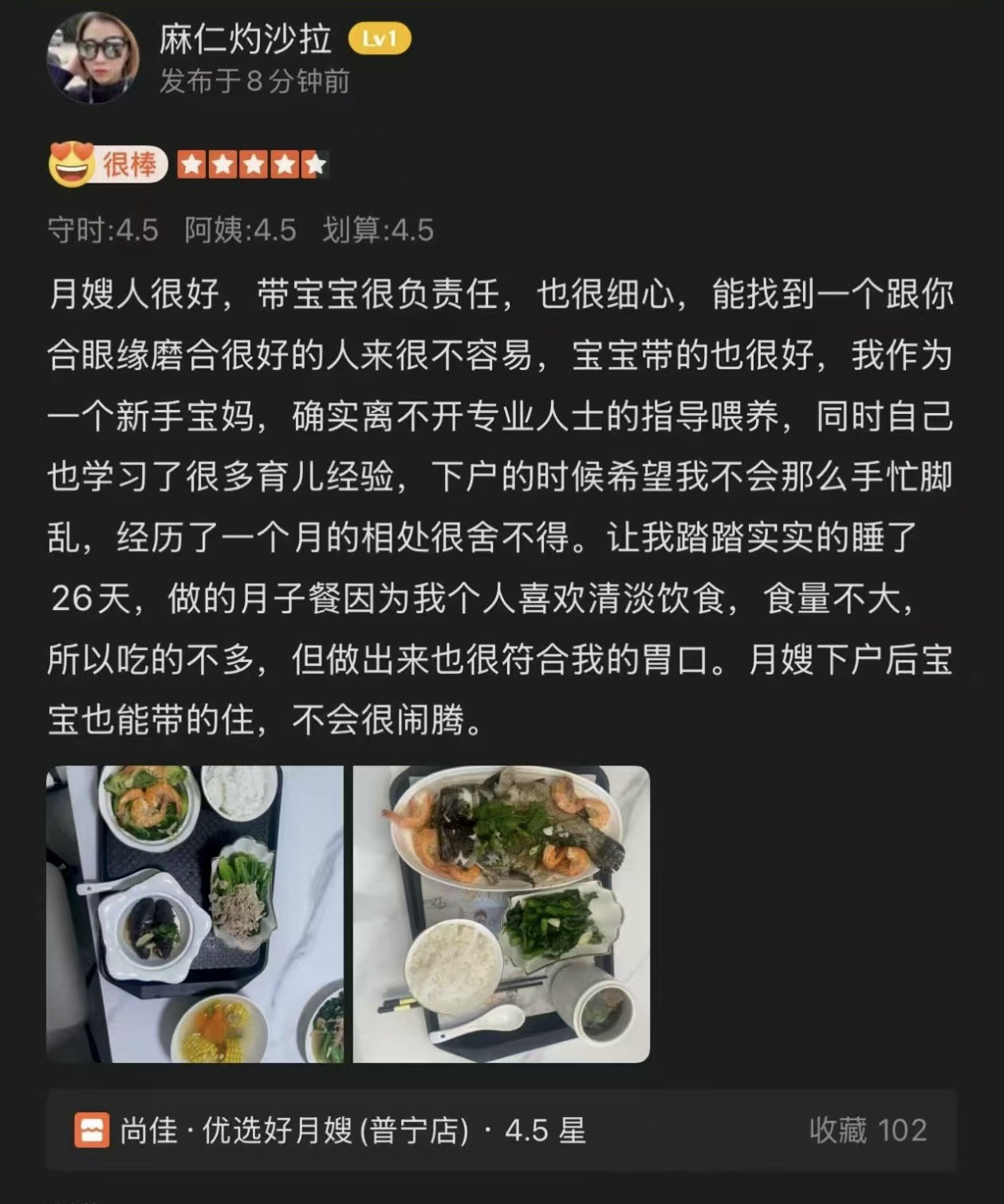 花姐待人熱忱,做事認(rèn)真又負(fù)責(zé)任。一直服務(wù)與潮汕地區(qū)家庭,潮汕話說的也是非常流利。在工作期間對(duì)寶寶照顧無(wú)微不至,有耐心,給寶寶護(hù)理方面很細(xì)心,比較注重細(xì)節(jié),很細(xì)致周到,護(hù)理手法熟練使客戶很放心。她細(xì)心照顧寶媽飲食起居,給予合理安排月子餐飲食,使寶媽得到很好的恢復(fù),也教會(huì)了客戶很多照顧寶寶方面的知識(shí)。