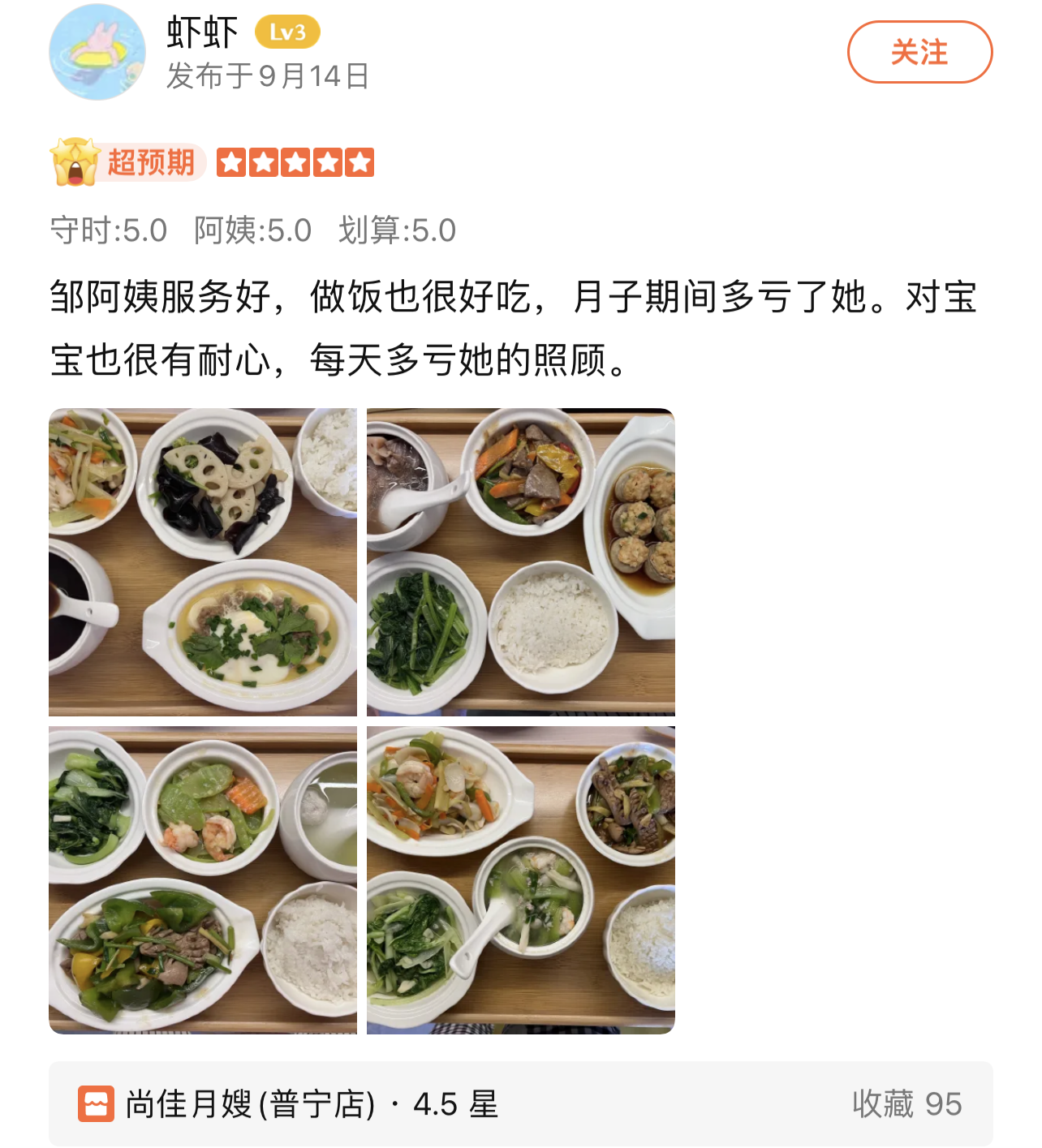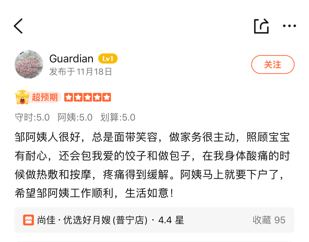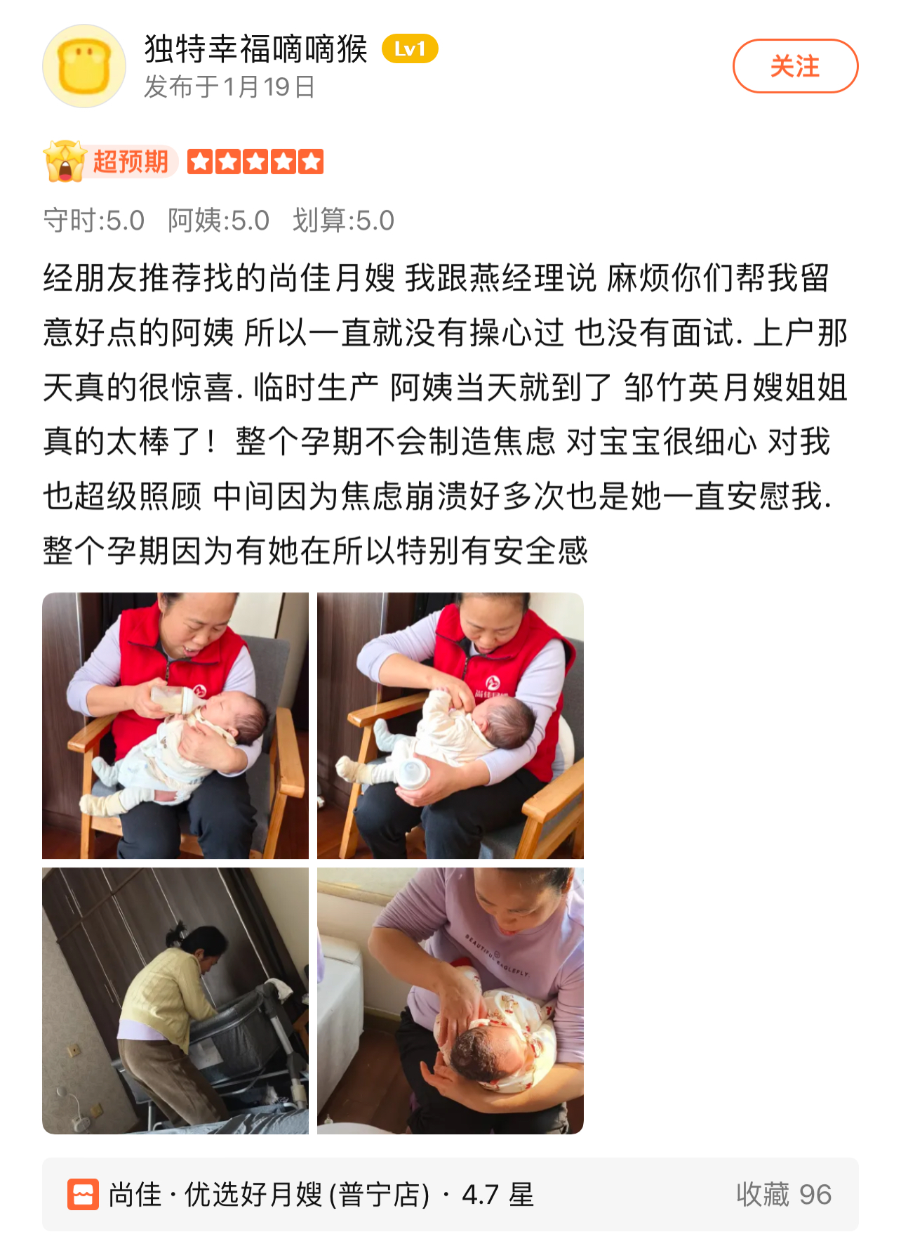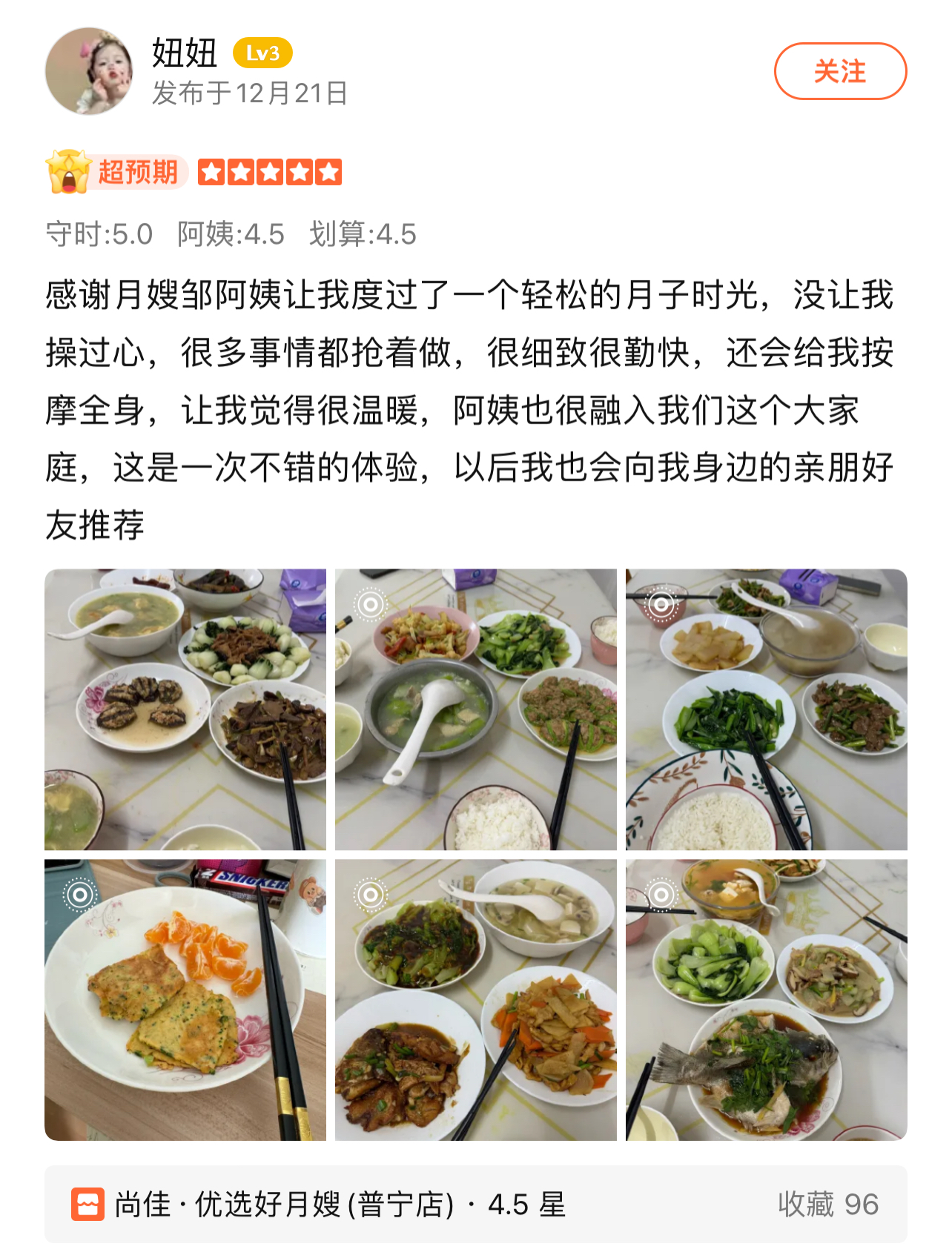 英姐雖然是江西瑞金人,家在潮汕都十出年了,等于半個汕頭人,英姐性格好,護(hù)理專業(yè)科學(xué),細(xì)心到位,和客戶相處融洽,月子餐美味,對寶寶護(hù)理很用心,細(xì)心;日常護(hù)理做得很到位,及時(shí)發(fā)現(xiàn)寶寶的身體癥狀并告知寶媽。英姐做的月子餐也很好吃,每天的菜色不帶重復(fù)的,也能及時(shí)調(diào)整寶媽的口味,非常棒!為人也很開朗,勤快,客戶的家人都贊不絕口! 極力推薦!