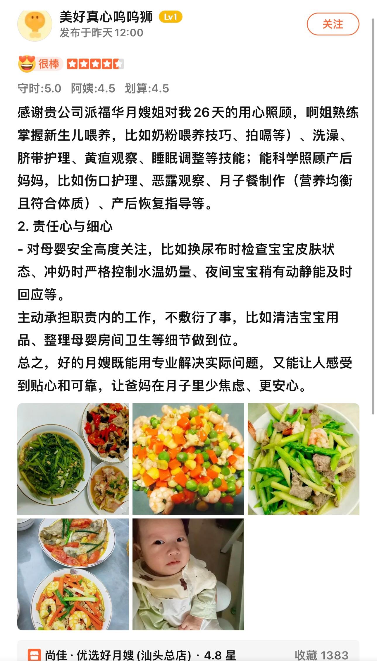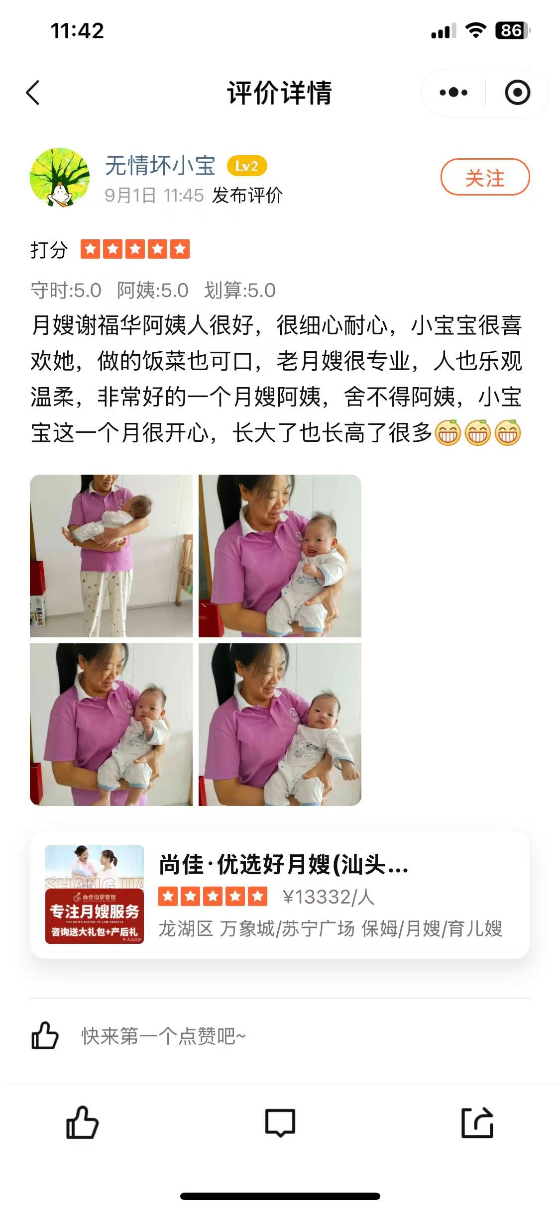 華姐性格開朗大方,以誠待人。她在月子期間工作認(rèn)真負(fù)責(zé),手腳非常勤快利落。她把寶寶和寶媽都照顧得很細(xì)致,每天都不厭其煩地悉心照料寶寶和寶媽的生活飲食起居,和客戶家里人也是友好相處。