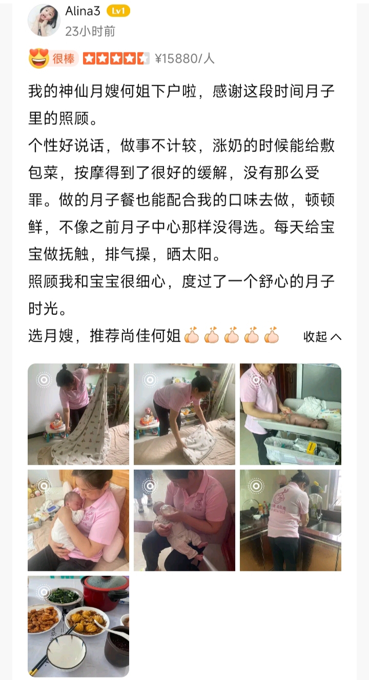 端姐來自福建玿安她是個(gè)隨和、大方、有愛心、負(fù)責(zé)任、愛崗敬業(yè)的好月嫂。她掌握了多項(xiàng)專業(yè)技能,加入尚佳月嫂也有一定年限了,擁有豐富的育嬰心得。月子餐方面比較擅長:閩南菜、粵菜、潮汕菜。在寶媽方面比較擅長:傷口護(hù)理、產(chǎn)后恢復(fù)操指導(dǎo)和健康飲食控制等;在寶寶方面比較擅長:預(yù)防鵝口瘡、尿布疹、黃疸護(hù)理、撫觸操和排氣操等。 和寶媽一家人相處和諧,做事不計(jì)較,值得推薦!