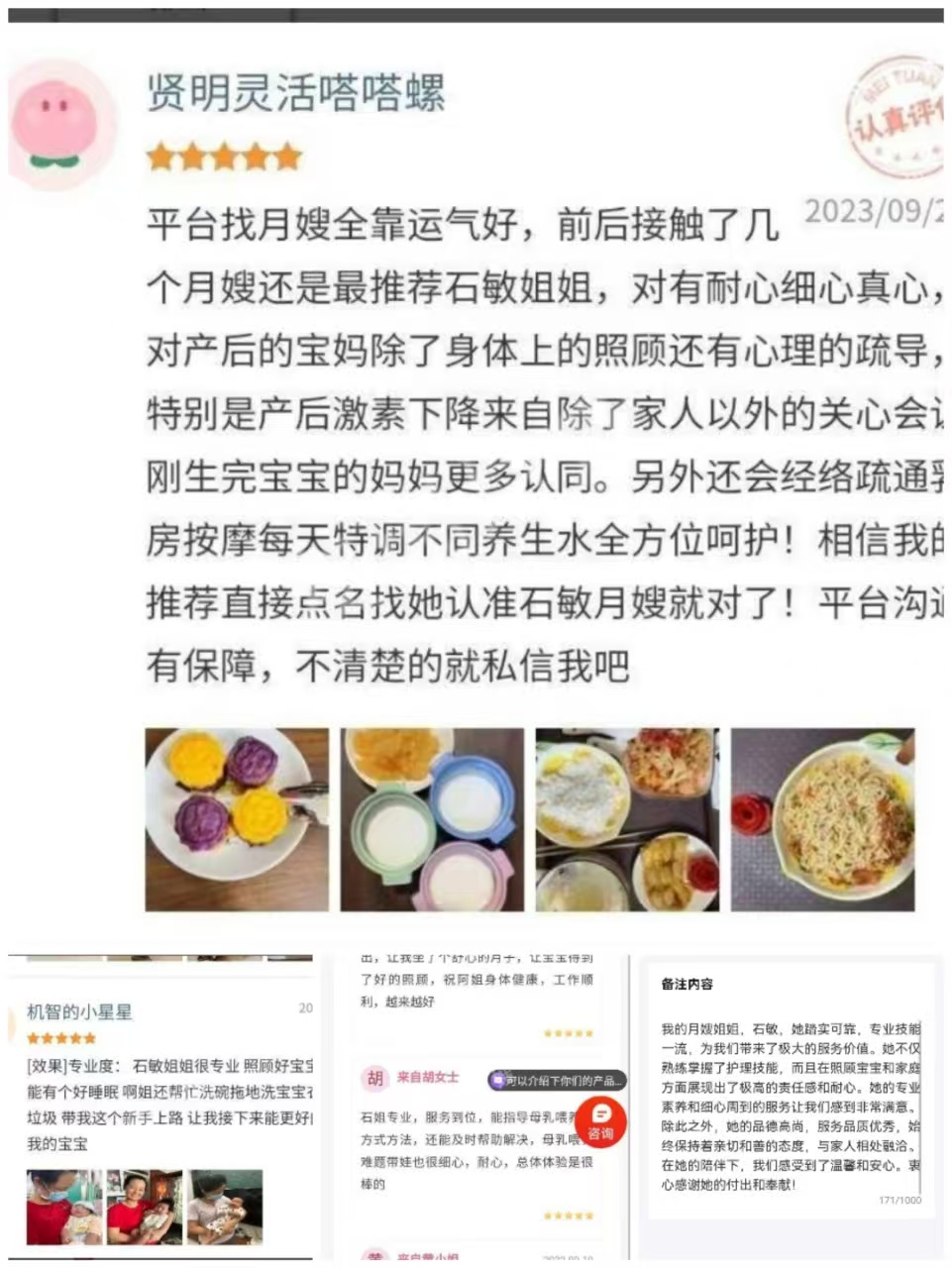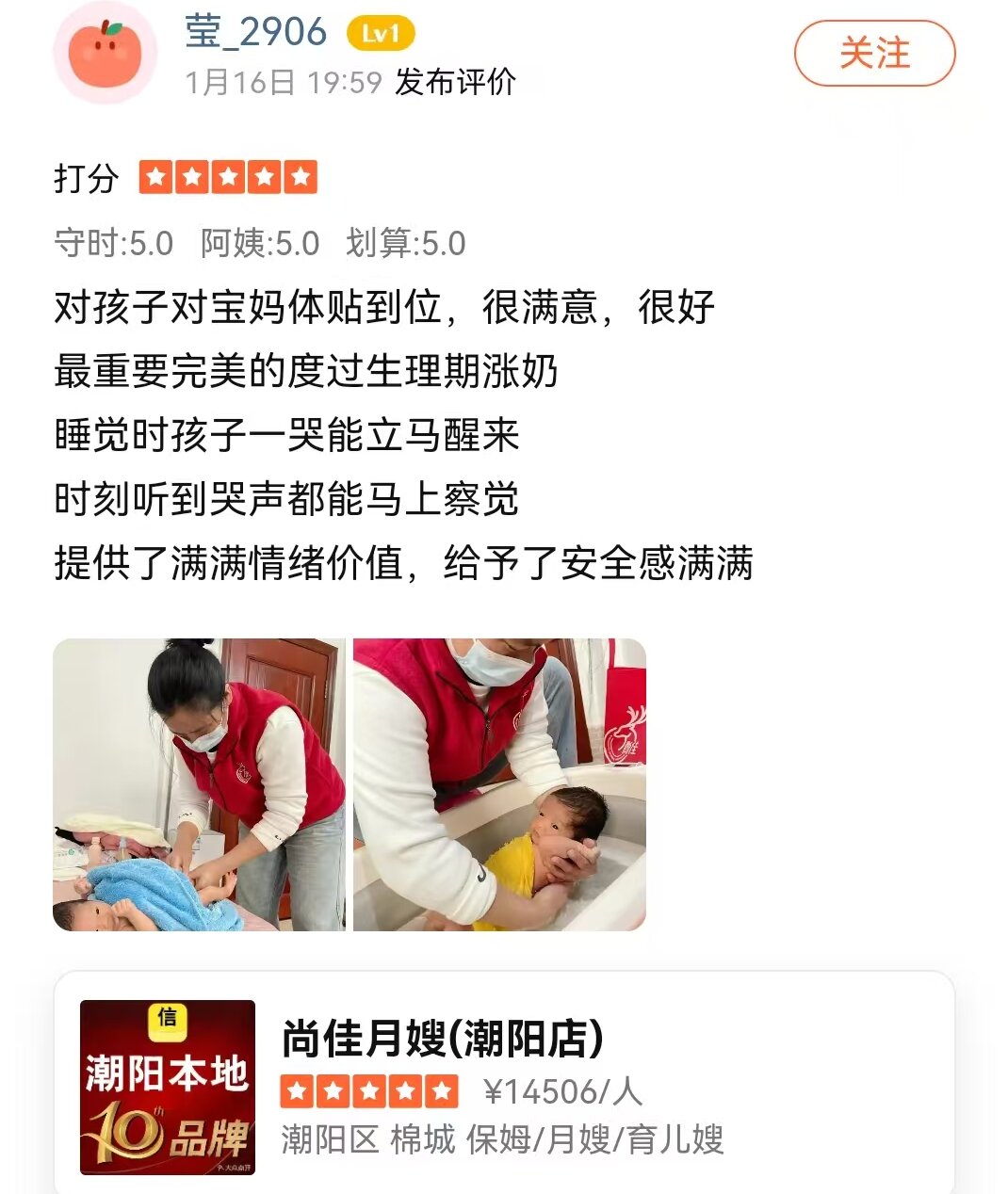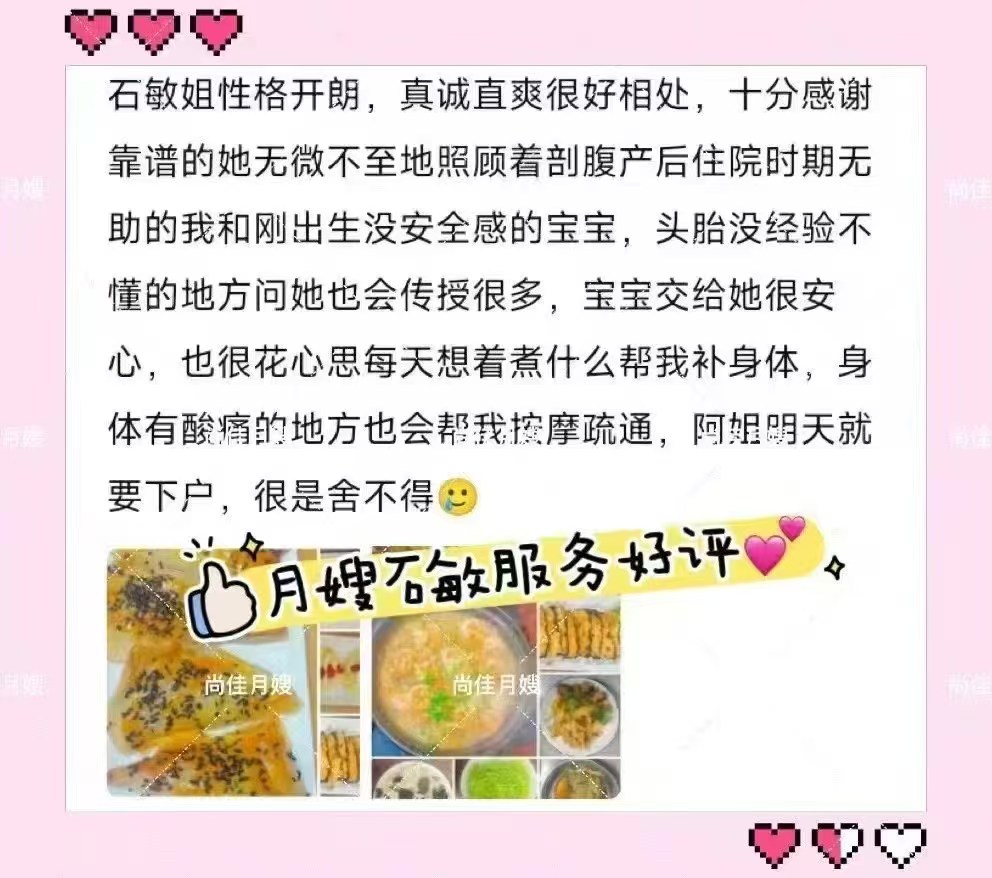 石敏姐姐來自河南潢川,2018年來到汕頭,開始結(jié)識了母嬰護(hù)理這個職業(yè),之后也開始勵志做一名專業(yè)月嫂,敏姐性格開朗,愛笑,在護(hù)理方面擅長每日黃疸觀察,臍部護(hù)理,做簡單的早早教,讓寶寶在月子里能夠茁壯成長,也能細(xì)心護(hù)理產(chǎn)婦,對產(chǎn)婦傷口的護(hù)理與協(xié)助產(chǎn)婦擦身、洗頭等,每次服務(wù)結(jié)束后,寶媽們對敏姐都給予高度的認(rèn)可,敏姐也是寶媽月子中值得擁有的一位好月嫂。。