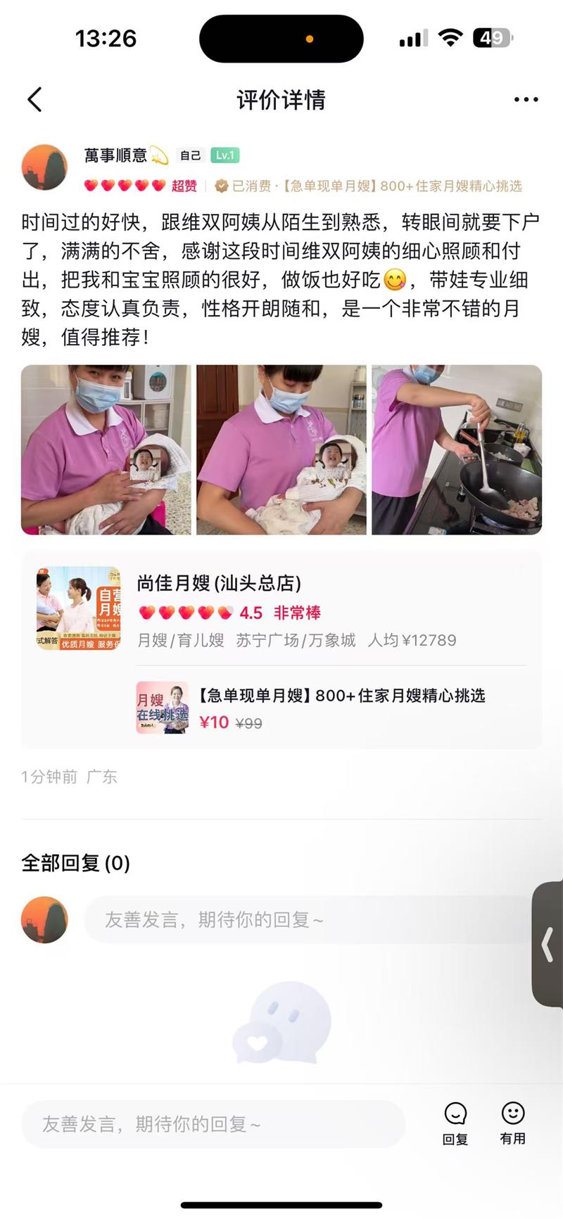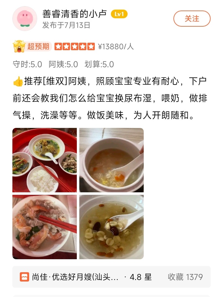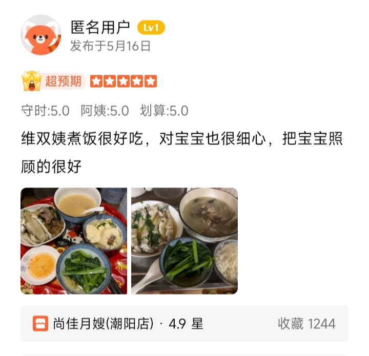 雙姐來自饒平,為人老實(shí),不善言詞,外表干凈利落,在護(hù)理新生兒方面很細(xì)心,洗澡、撫觸、排氣操都很熟練、耐心,也很注重跟寶寶的互動(dòng),進(jìn)行聽覺視覺的開發(fā),調(diào)整寶寶的作息時(shí)間,注意細(xì)節(jié),觀察寶寶皮膚、氣色、大小二便跟動(dòng)態(tài),預(yù)防紅臀、熱疹,及時(shí)控制濕疹、黃疸,讓寶寶健康成長(zhǎng);對(duì)產(chǎn)婦乳房護(hù)理、惡露觀察等寶媽護(hù)理做得也很好,月子餐營(yíng)養(yǎng)搭配又美味。坐月子有雙姐,妥妥滴!