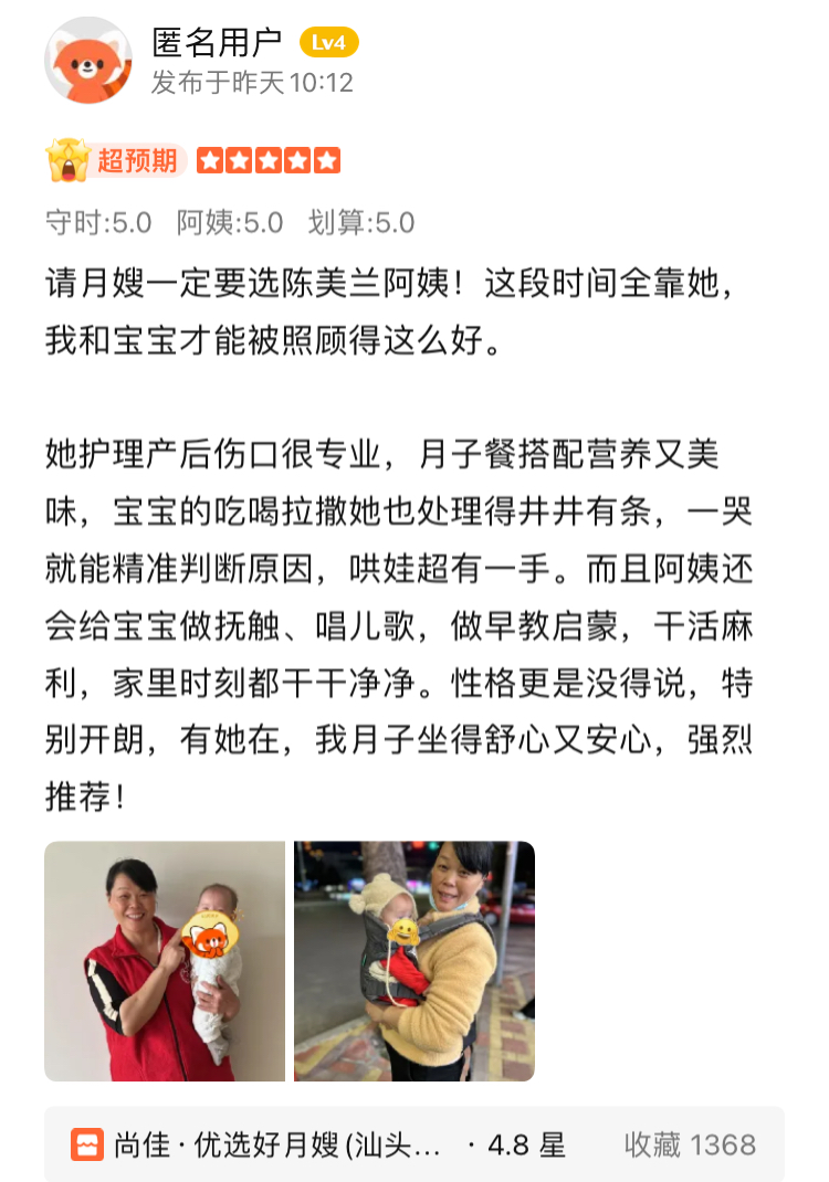 陳美蘭姐姐來自廣西合浦,她非常喜歡小孩子,對(duì)嬰幼兒護(hù)理頗有心得!她為人熱情大方,待人和善,非常樂于助人。為了更好地服務(wù)好客戶,她參加了尚佳公司平臺(tái)提供的考試,考取月嫂證,具備專業(yè)的月嫂技能。在月子餐方面,她比較擅長煲湯、潮汕月子餐等。
