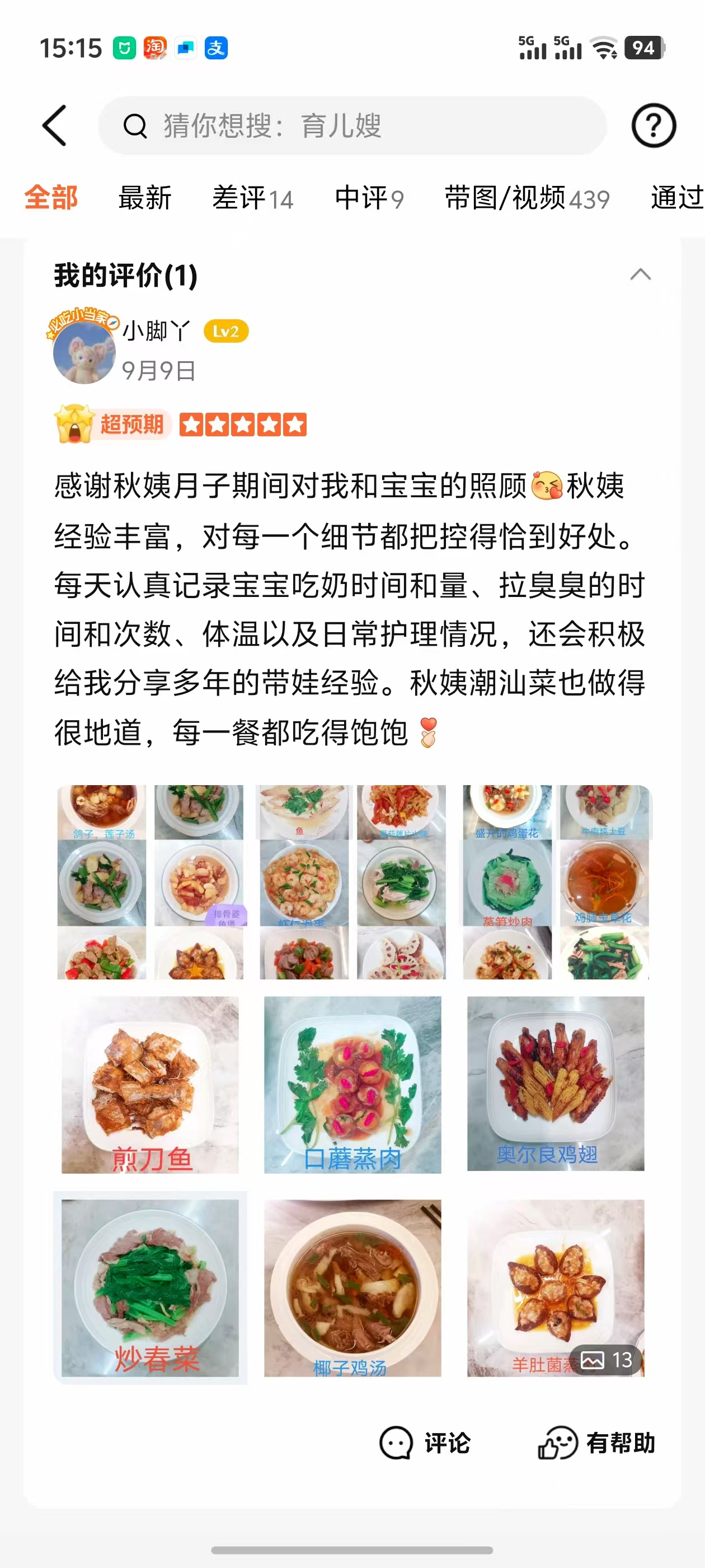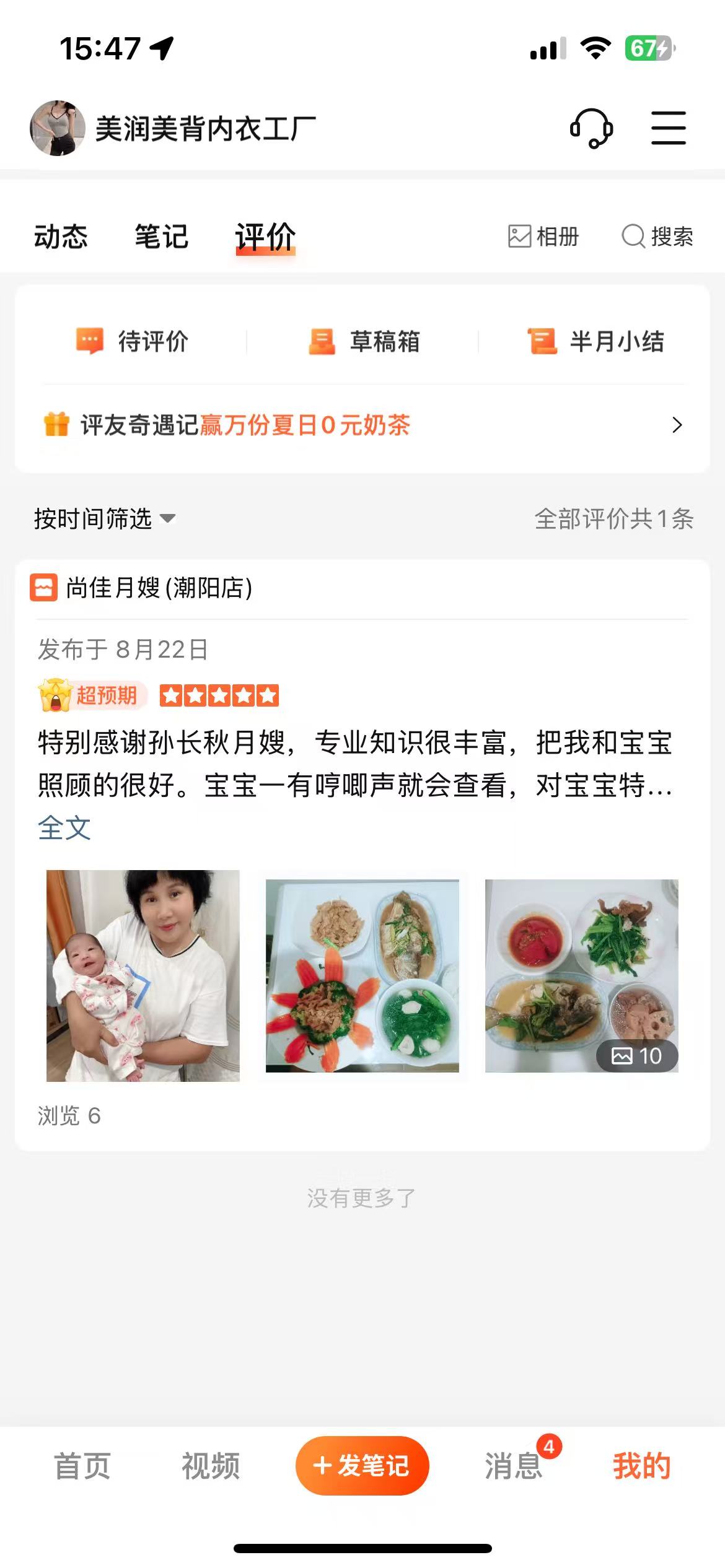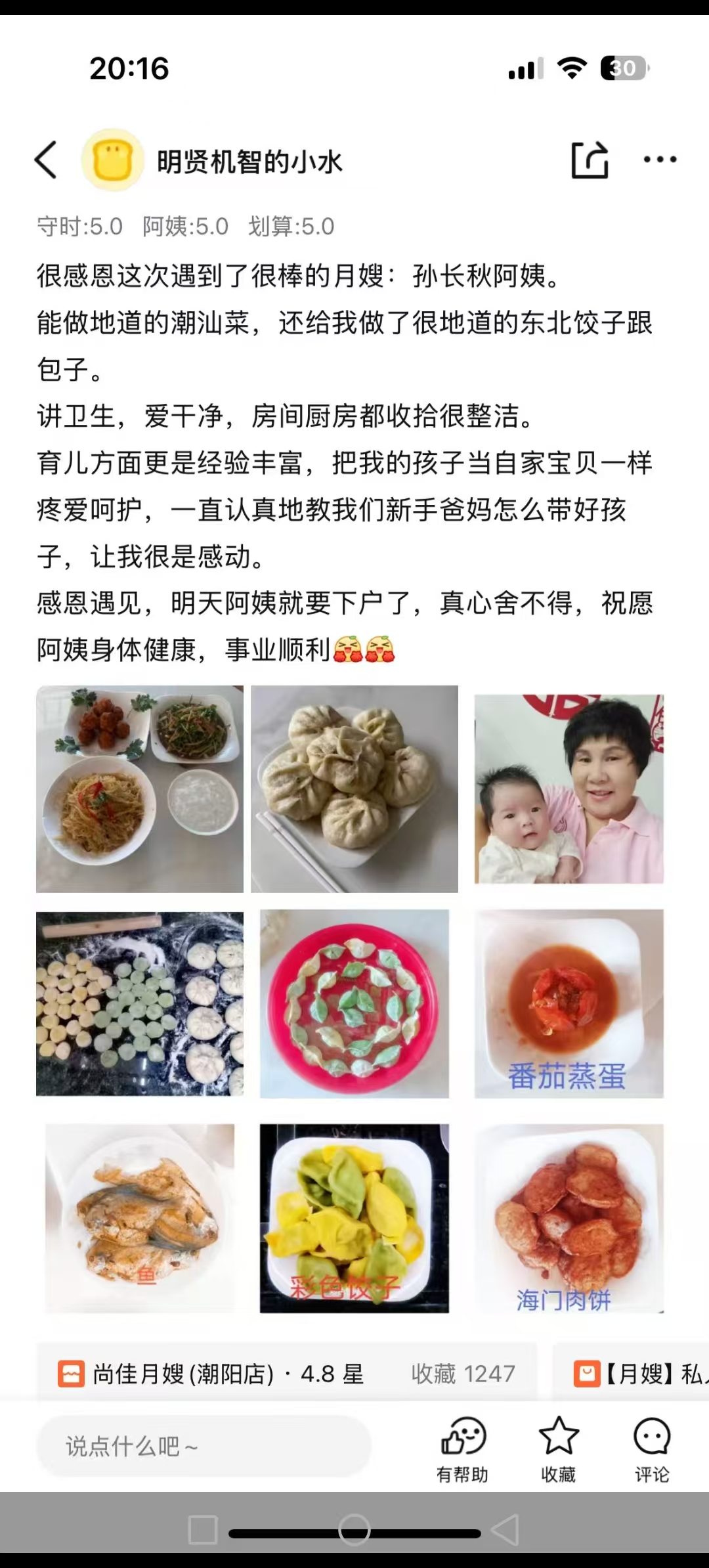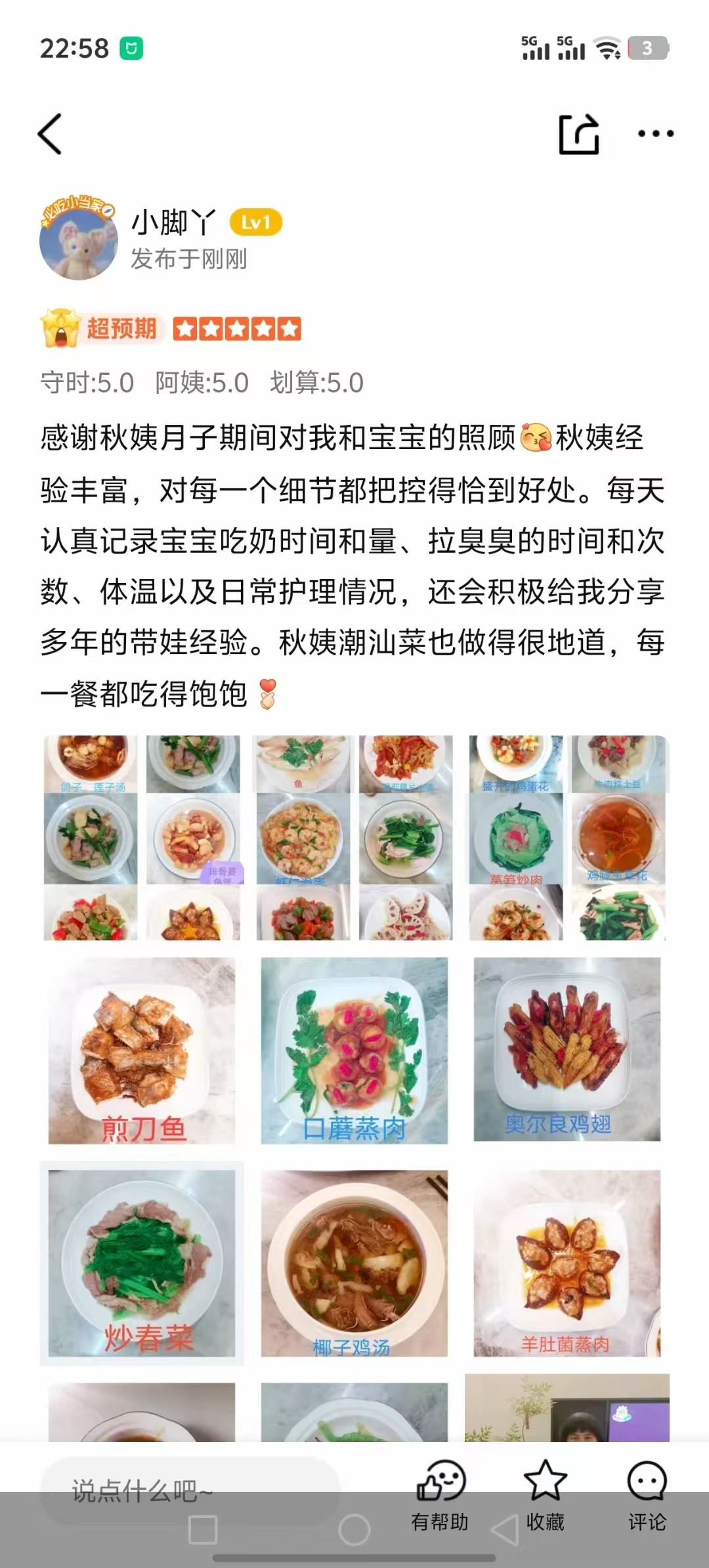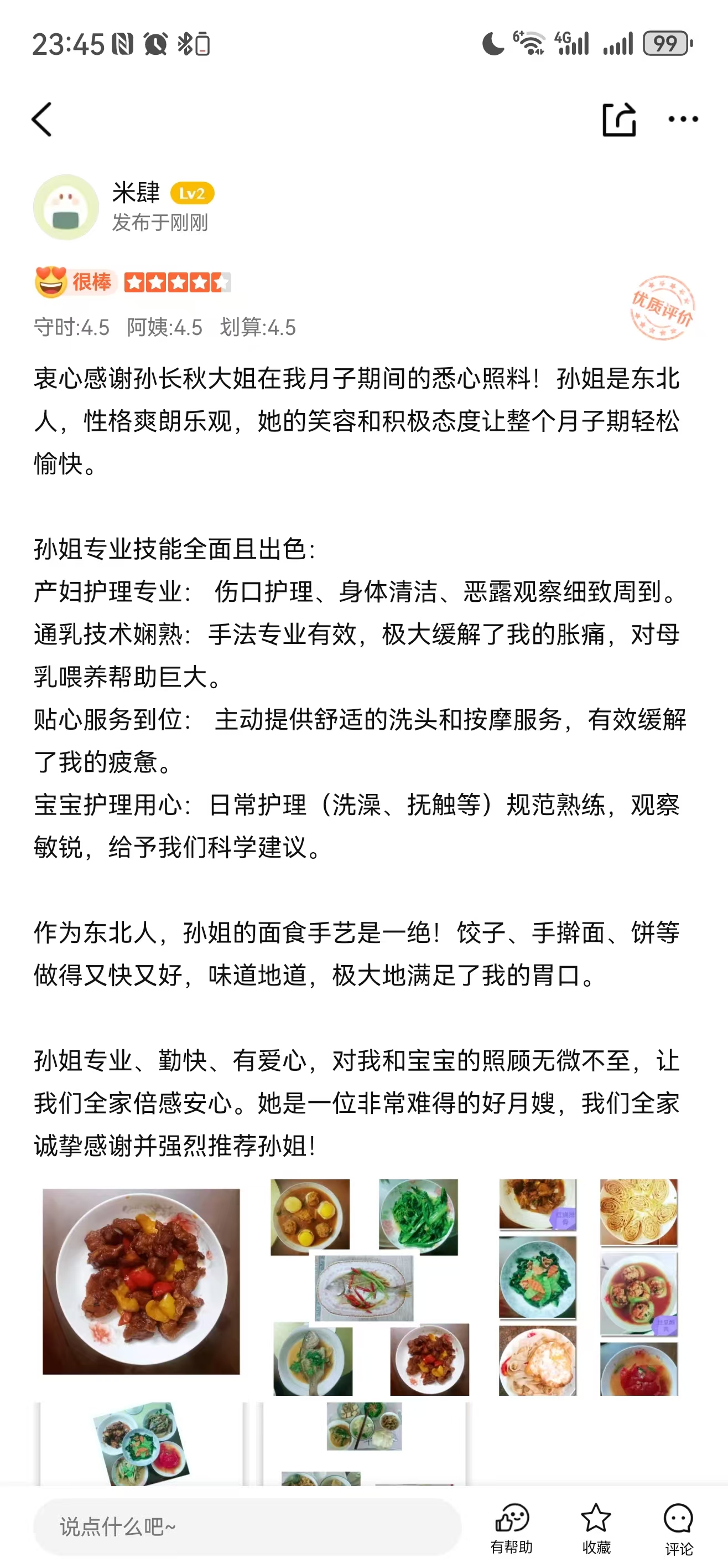 孫阿姨來自黑龍江雞西市,會粵語,性格開朗,熱情大方,細(xì)心有耐心,做事有規(guī)劃會提前做充分準(zhǔn)備。從事母嬰行業(yè)多年,服務(wù)了多個母嬰家庭,帶過多個雙胞胎家庭,擅長新生兒日常喂養(yǎng)活及清潔護理,新生兒黃膽、紅臀、腹瀉、消化不良的辯別及護理,撫觸、被動操寶寶作息規(guī)律的培養(yǎng)。對于產(chǎn)婦起居照料、傷口護理與消毒、產(chǎn)后開奶和乳房護理、惡露排出護理、科學(xué)的母乳喂養(yǎng)指導(dǎo)。調(diào)理寶媽既有母乳給寶吃又不胖的月子步,各種營養(yǎng)善食搭配!做菜美味可口,擅長潮汕菜,煲湯還會做面食。工作認(rèn)真負(fù)責(zé),細(xì)致周到!孫阿姨每次服務(wù)都能得到寶媽及家