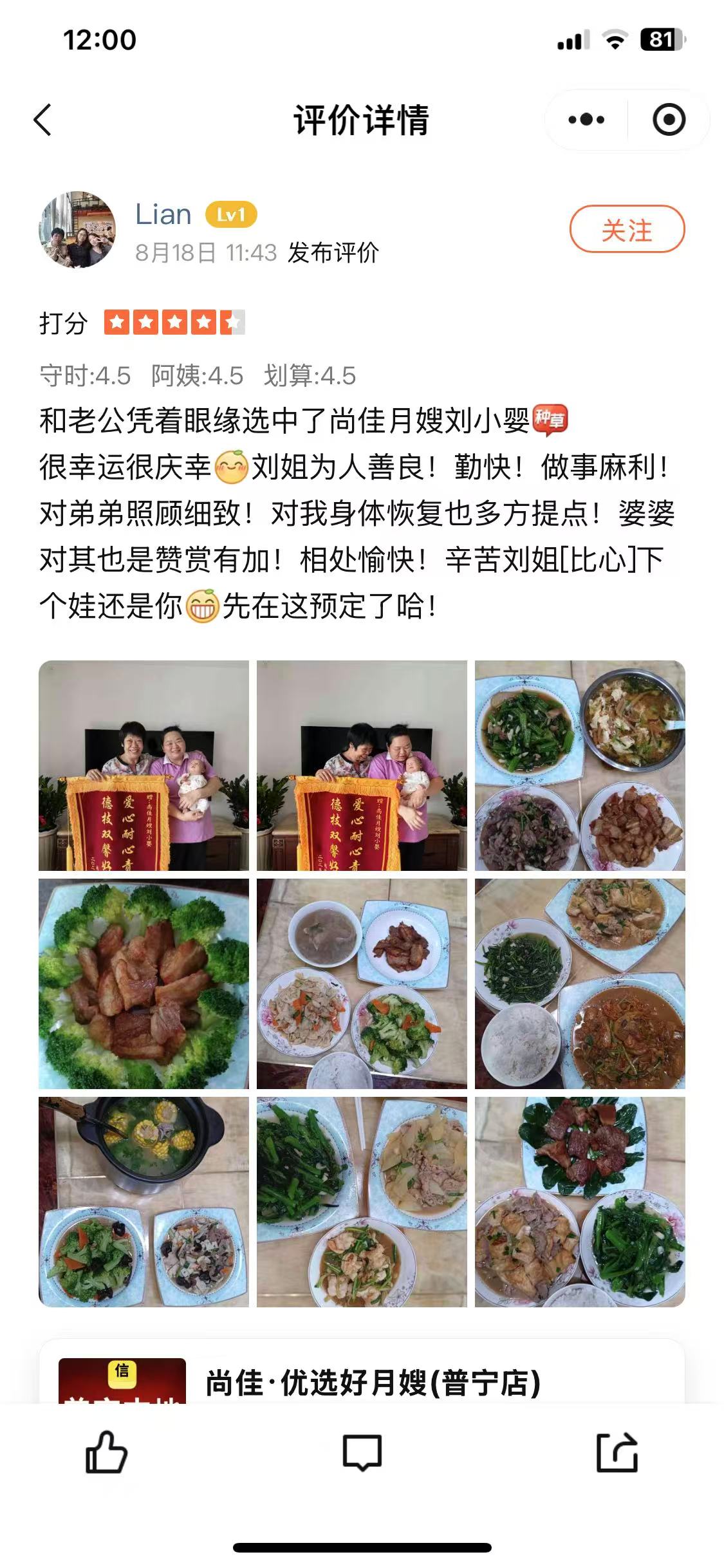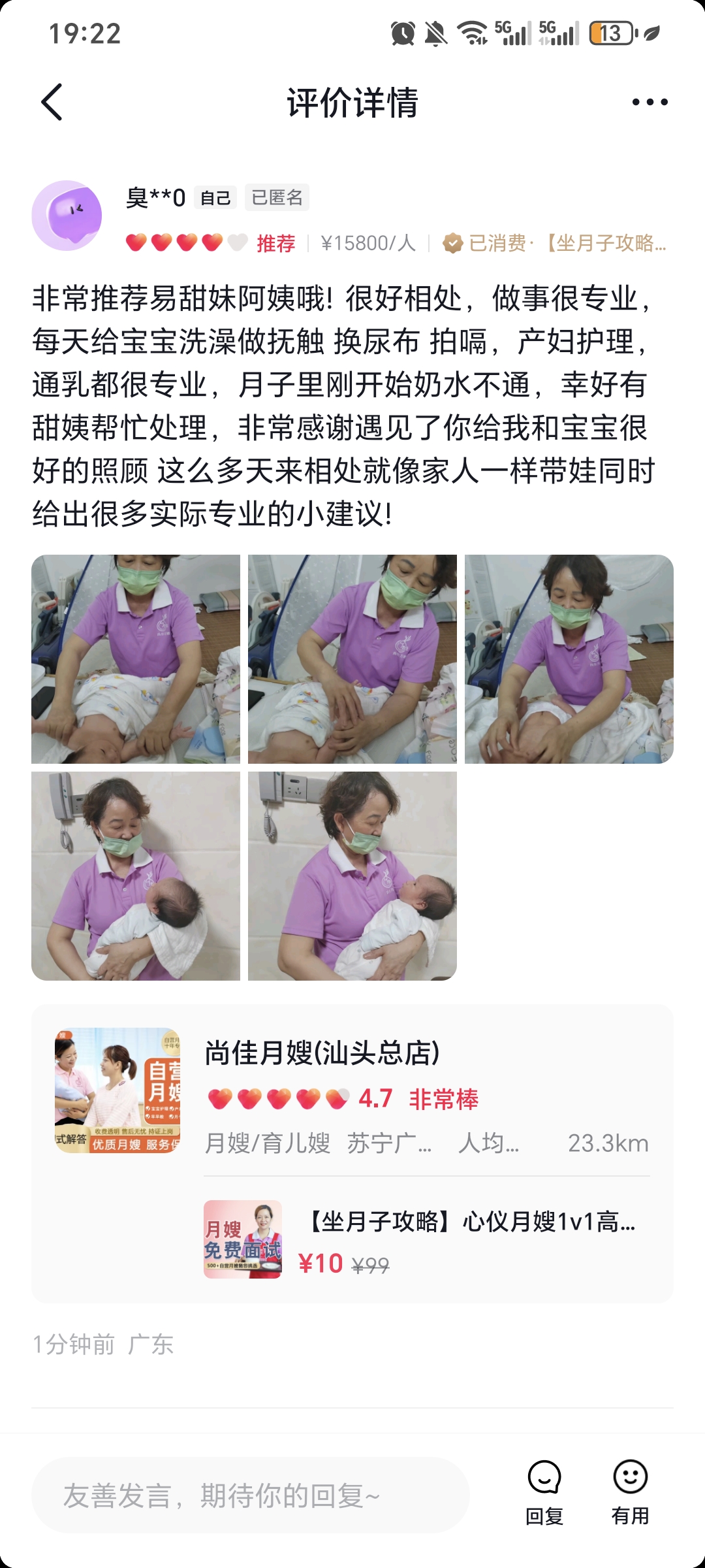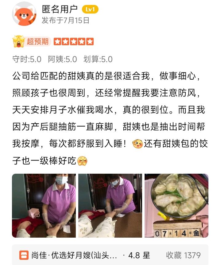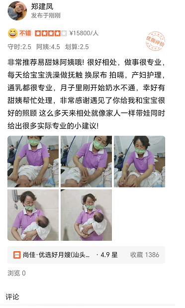 甜姐是廣東羅定人,在潮汕十多年了,性格溫和,和藹可親,笑瞇瞇,做事細(xì)膩,細(xì)心到位,她是個隨和、大方、有愛心、負(fù)責(zé)任、愛崗敬業(yè)的好月嫂。她掌握了多項專業(yè)技能,如母嬰護理師、育嬰師和催乳師等,為了更好地服務(wù)好客戶提供了很好的理論基礎(chǔ)。在這兩年多的母嬰護理師的工作中,對每一位寶媽都真誠的服務(wù),讓每一位寶媽在月子里就能迅速的把身體養(yǎng)好。在護理新生兒和產(chǎn)婦方面很細(xì)心到位,黃疸觀察,肚臍消毒,撫觸,被動操,早早教的教導(dǎo),乳房基本護理,檫浴,及身體適當(dāng)按摩,惡露觀察等日常護理。