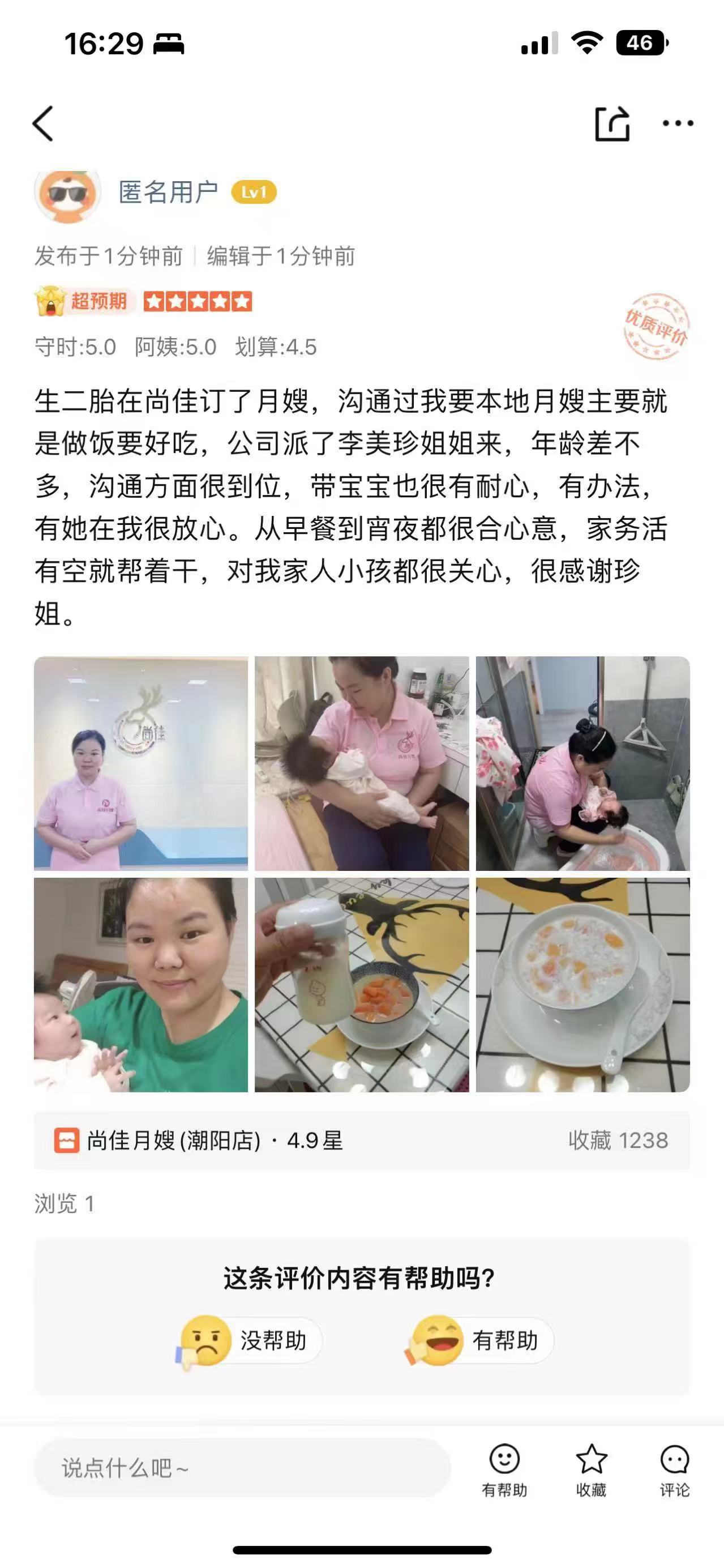 李阿姨已從事母嬰行業(yè)多年,性格溫和,護(hù)理細(xì)致。擅長寶寶護(hù)理和產(chǎn)婦護(hù)理,做得一手地道潮汕月子餐。每一位護(hù)理過的寶媽都在夸阿姨跟寶寶互動(dòng)性很好,同家人相處愉快,和產(chǎn)婦默契配合。