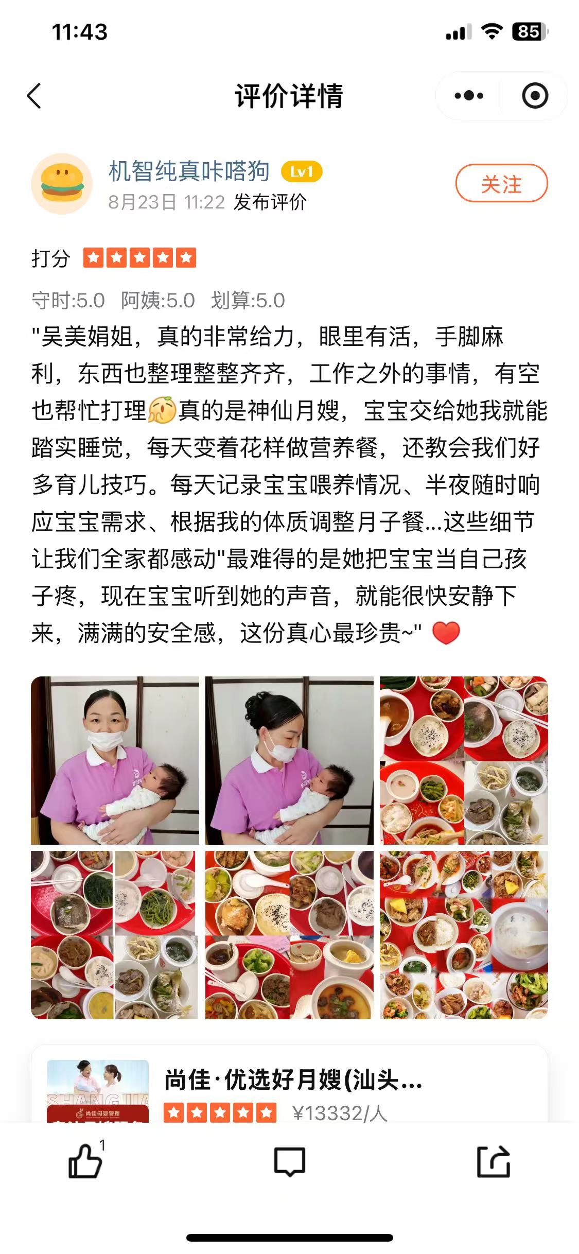 吳美娟來(lái)自湖北省陽(yáng)新縣,年輕眼里有活是她的標(biāo)簽,入行以來(lái)接觸過(guò)月子中心和醫(yī)院?jiǎn)?,后續(xù)轉(zhuǎn)行住家月嫂,對(duì)寶寶的護(hù)理、疾病觀察都很熟練,對(duì)媽媽產(chǎn)后的觀察呵護(hù)也是非常細(xì)心,月子餐做的也很不錯(cuò),是值得信賴的月嫂阿姨~