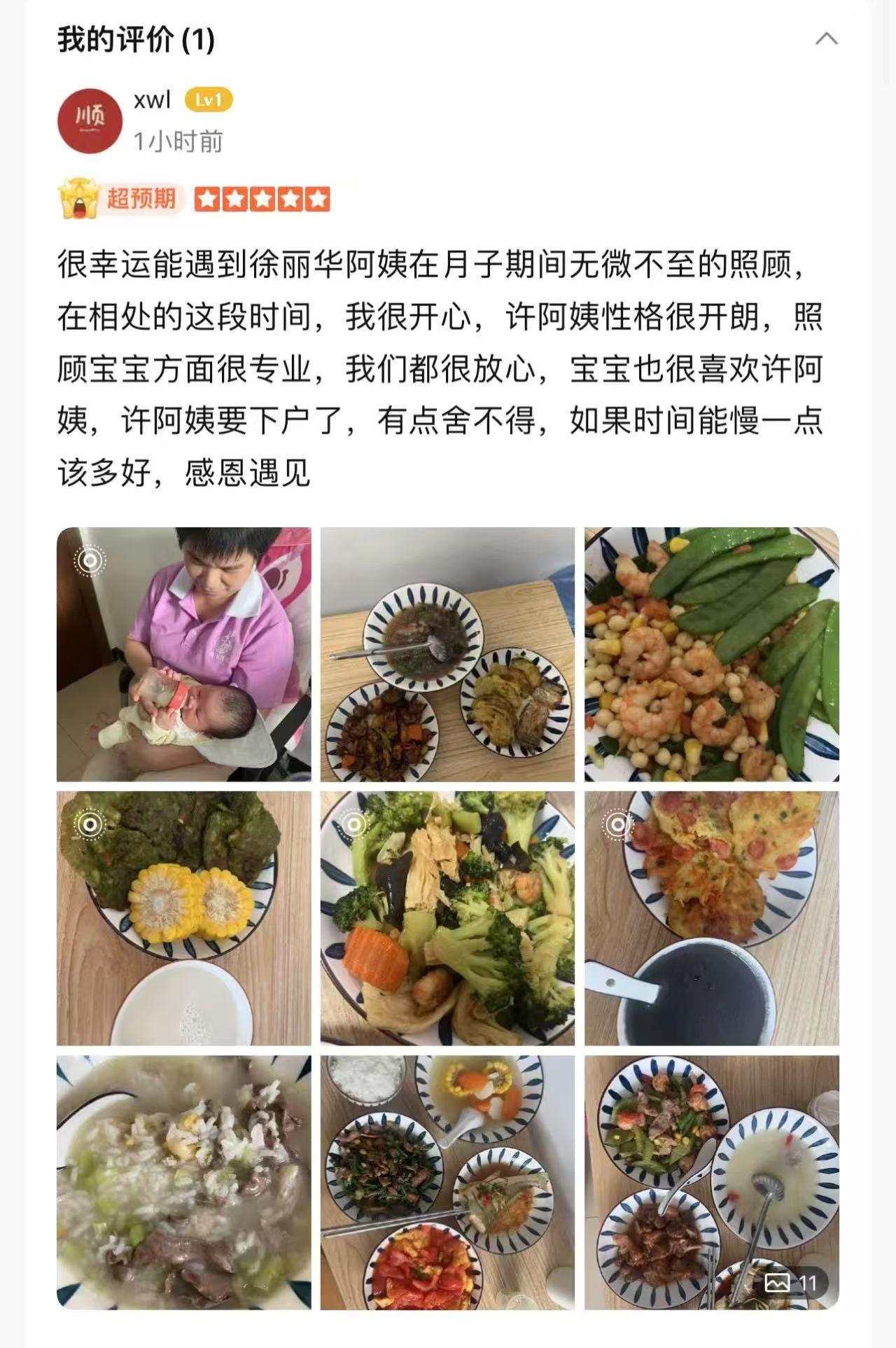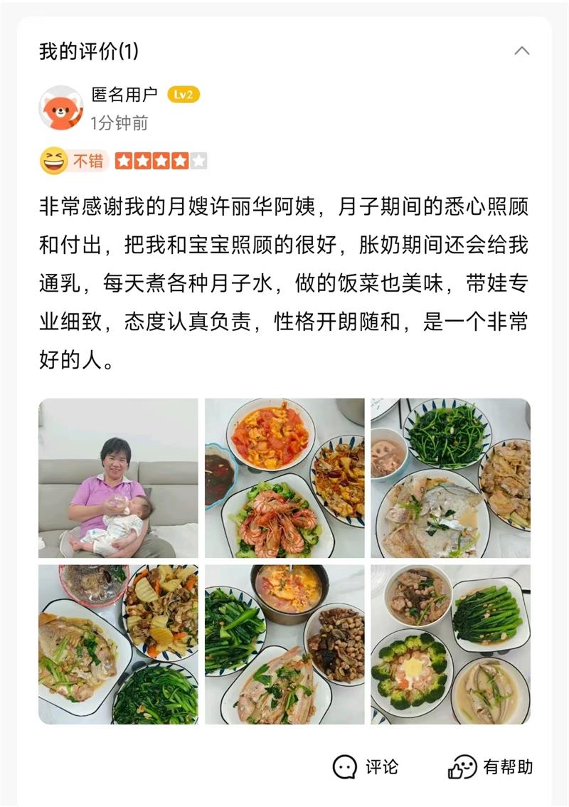 許姐來自福建詔安,會說潮汕話,溝通能力強,為人老實熱心,因喜歡寶寶加入了母嬰護(hù)理行業(yè),對寶寶的護(hù)理非常細(xì)致,更換紙尿褲、洗澡,三操等都很細(xì)心,對產(chǎn)婦也是日常關(guān)心,做的月子餐也很不錯。